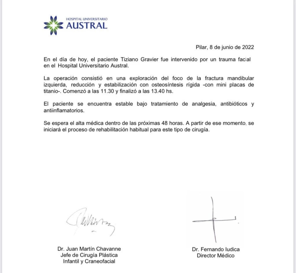 El joven fue hospitalizado en el Hospital Austral. Desde allí emitieron un nuevo comunicado sobre su estado de salud actual: "En el día de hoy , el paciente Tiziano Gravier fue intervenido por un trauma facial en el Hospital Universitario Austral", comienza el escrito.