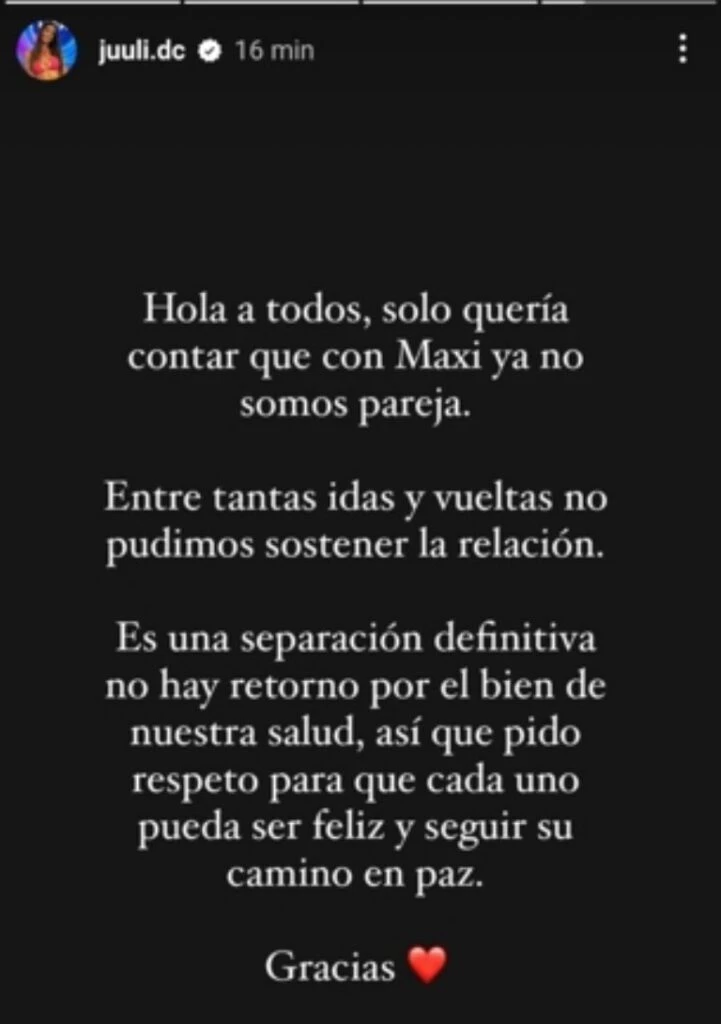 La semana pasada Juliana Díaz, quien era la pareja de Maxi Giudisi, confirmó a través de sus historias de Instagram, que están nuevamente separados. "Hola a todos, quería contar que con Maxi ya no somos pareja", comenzó revelando. Luego, explicó: "Entre tantas idas y vueltas no pudimos sostener la relación".