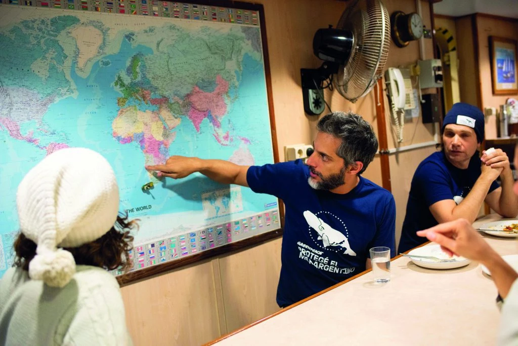“Vine de mochilero a los 16 años, en el ’90, con el pelo largo y un medallón grande que decía ‘Salven a las ballenas’”, cuenta después de la cena a bordo. “Y luego, para interpretar a Beto Bubas, el guardafauna que escribió la historia en que se basó la película El faro de las orcas, también junto a Maribel”. Precisamente con este hombre –que entabló una relación única con las orcas, por ejemplo– se reencontró en el buque y recorrió la Península Valdés para embarcarse y ver las ballenas. “Aprendí mucho con él. Una de las cosas que me dijo es que está en contra de que existan reservas naturales. Como si nosotros, si no existieran, fuéramos destructivos con esa área”, explica.