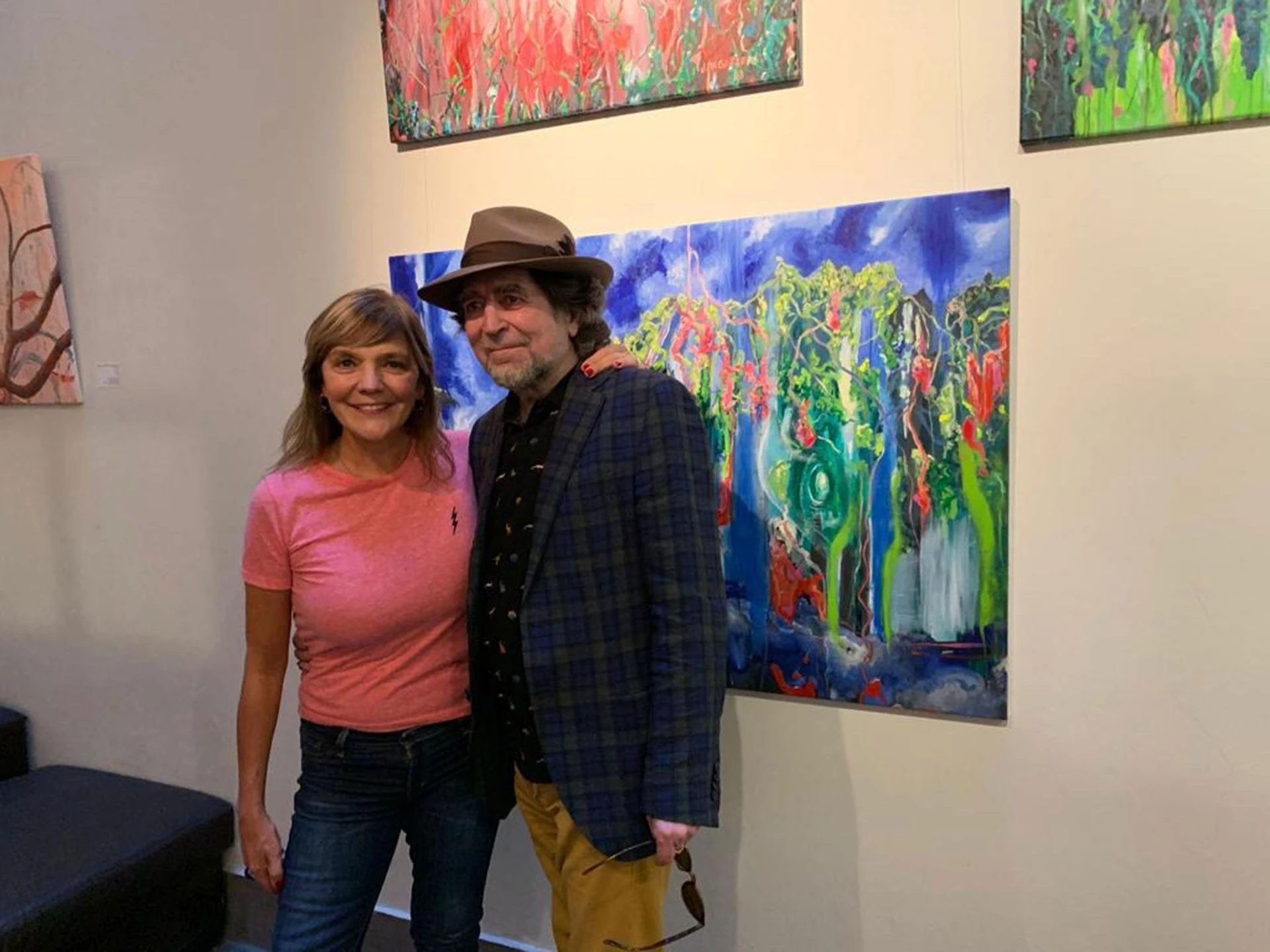 Sabina y Jorgela Argañarás en la muestra viva El hierro será el hierro, pero el lirio es el lirio.El momento de las fotos en el porteño Art Hotel, tras la sorpresa por la llegada del español.“Me encanta cómo utiliza el color Jorgela. Lo hace con total libertad y sin estar atada a nada “, ponderó Joaquín a la artista.Sabina en la exhibición de pinturas, que se presenta de 7 a 23 horas en Azcuénaga 1268, Recoleta. Luego viajaría a Córdoba, para intervenir de manera magistral en el Congreso de la Lengua.Arañarás junto a su colega Damián Masotta, quien también expone sus obras en la muestra curada por Miguel Ronsino, que llegara al Art Hotel por gestión de la también curadora Luz Moyano.