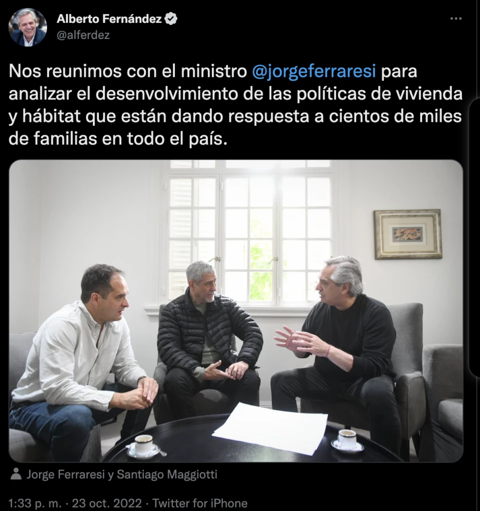 El anuncio presidencial fue a través de una serie de hilos en Twitter en los que se publicó una foto de Fernández junto a Ferraresi y a Maggiotti, reunidos, luego de destacar el desenvolvimiento de las políticas de vivienda y hábitat "que están dando respuesta a cientos de miles de familias en todo el país”.