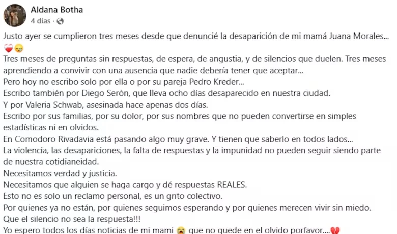 En su mensaje, la mujer amplió el reclamo más allá del caso de su madre y de Pedro Alberto Kreder, la pareja de Juana que también permanece desaparecida. “No escribo solo por ella o por su pareja Pedro Kreder. Escribo también por Diego Serón, que lleva ocho días desaparecido en nuestra ciudad. Y por Valeria Schwab, asesinada hace apenas dos días”, sostuvo, al vincular su dolor personal con una problemática más amplia.