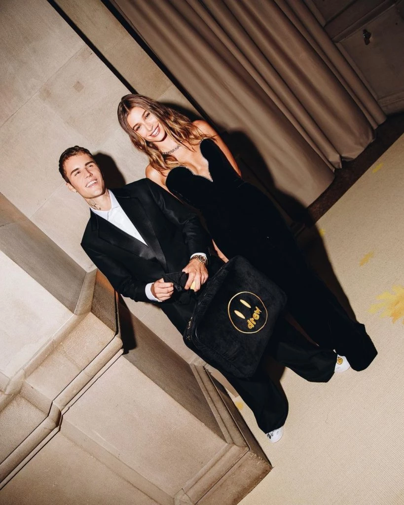 Al mismo fue acompañado con su esposa la modelo Hailey Baldwin, con quien fueron en combinación. Ella vistió un elegante vestido negro de noche de la Blue Book Collection de Tiffany & Co y él utilizó un traje negro acompañado de unos pantalones acampanados, muy parecidos a los que se utilizaban en la década del 70.