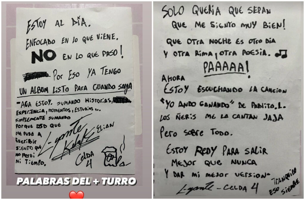 Ayer, desde prisión, volvió a compartir una carta en donde se mostró más resiliente que nunca: "Gracias a todos por el aguante de corazón que me hacen!", escribió con un marcador negro sobre una hoja de un cuaderno.