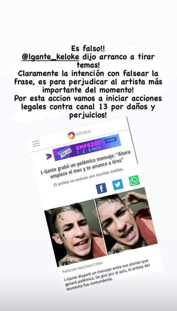 La nota titulada “L-Gante grabó un polémico mensaje: ‘Ahora empiezo el mes y te arranco a tiros’”, fue compartida por el letrado y afirmó, “Es falso!!@lgante_keloke dijo que arrancó a tirar temas! Claramente la intención con falsear la frase, es para perjudicar al artista más importante del momento!”. Y sumó: “Por esta acción vamos a iniciar acciones legales contra canal 13 por daños y perjuicios!”. A las pocas horas el posteo también fue compartido por L-Gante.