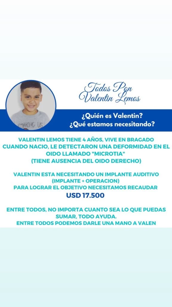 Por su parte esta mañana el cantante de cumbia anunció a través de su cuenta de Tik Tok que gracias a la rápida aceptación de sus amigos celebrities, el dinero ya pudo ser recaudado y Valentín próximamente podrá mejorar su condición auditiva.