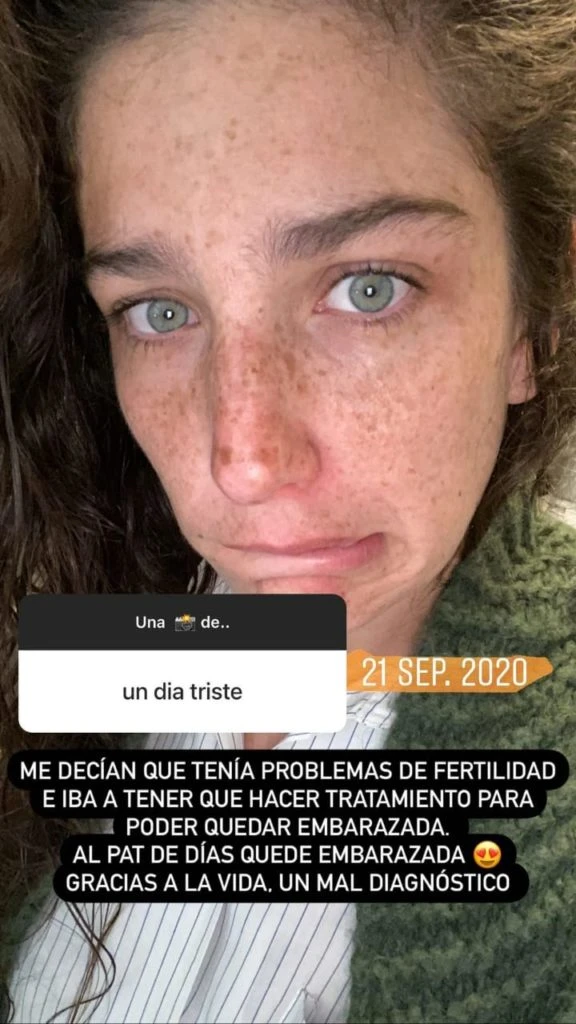 En las últimas horas, la actriz hizo referencia a esto a través de sus historias de Instagram. En tren de confesiones, un usuario le pidió que compartiiera una foto de su “día más triste”. Esto la llevó a que enviara información desconocida para la mayoría. La historia se remonta a septiembre, cuando junto a su pareja quisieron volver a ser padres. “Me decía que tenía problemas de fertilidad e iba a tener que hacer tratamiento para poder quedar embarazada. Al par de días quedé embarazada. Gracias a la vida, un mal diagnóstico”, recordó.