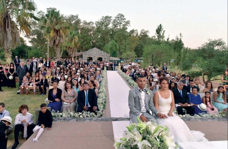 Camino al altar: en Carmelo se cuidaron todos los detalles. Vista aérea del campo y la piscina. Impactantes. De día, Carlos cantó con el grupo Piola Vago, al tiempo que Vanesa, su fan número uno, se divertía. A la tardecita se cambiaron por separado, para presentarse en la ceremonia frente a la capilla San Jorge, en Puerto Camacho. Florencia y Katie anunciaron el ingreso de la novia. Lito llegó de la mano de su papá. El momento de los anillos frente al cura, Pancho Peña: “Ya son marido y mujer”.