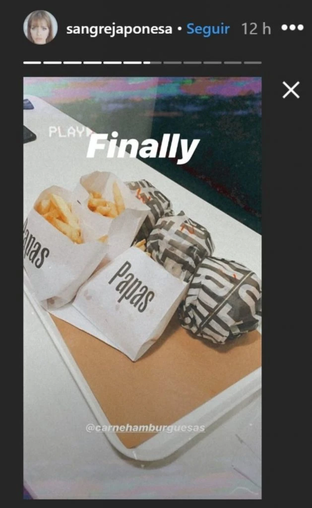 En el video se la ve comiendo un stick supuestamente frito, actriz en el momento del bocado dice en inglés “Unbelievable” (Increíble). Además, subió una foto en la que se puede ver tres hamburguesas con sus respectivas papas fritas y la palabra “Finally” (Finalmente).