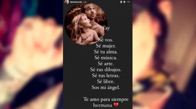 "Tay. Sé vos. Sé mujer. Sé tu alma. Sé arte. Sé tus dibujos. Sé tus letras. Sé libre. ¡Sos mi ángel. Te amo para siempre hermana", manifestó en sus Instagram stories. Además, eligió una tierna postal en la que posa junto a su por entonces hermano. Además, le escribió: "Te amo para siempre, hermana".