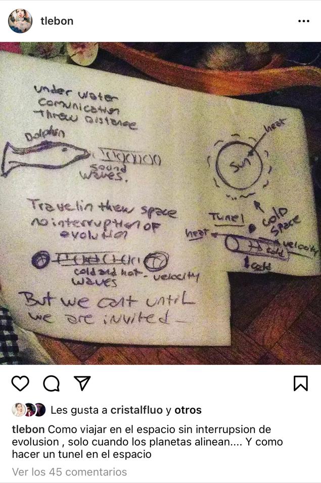 Con dibujos y gráficos a mano alzada hechos por ella, la artista teorizaba sobre los viajes en el espacio y otros misterios que intentaba desentrañar.