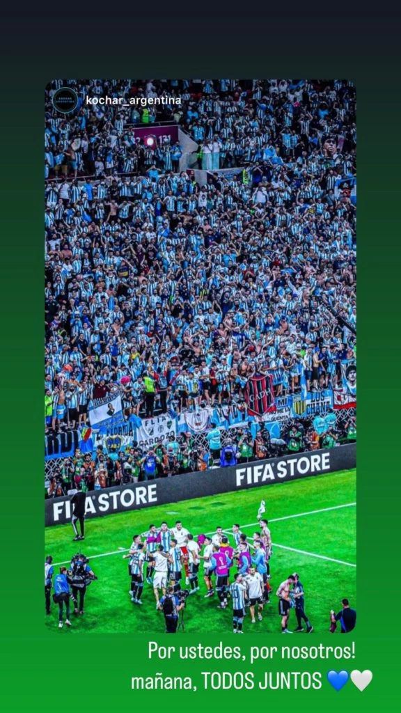 "Por ustedes, por nosotros! MAÑAN TODOS JUNTOS", escribió en una historia de Instragram el novio de Tini Stoessel, sumando una bella foto de todos los jugadores saltando y festejando, con las tribunas llenas de banderas y camisetas albicelestes.