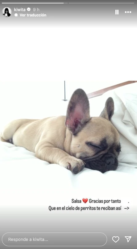 A su vez, la mamá de Lola, Sara Stweart Brown, conocida como Kiwita, subió una historia despidiéndose de su perrito. Con una tierna foto del animal durmiendo, escribió: "Salsa. Gracias por tanto. Que en el cielo de perritos te reciban así".