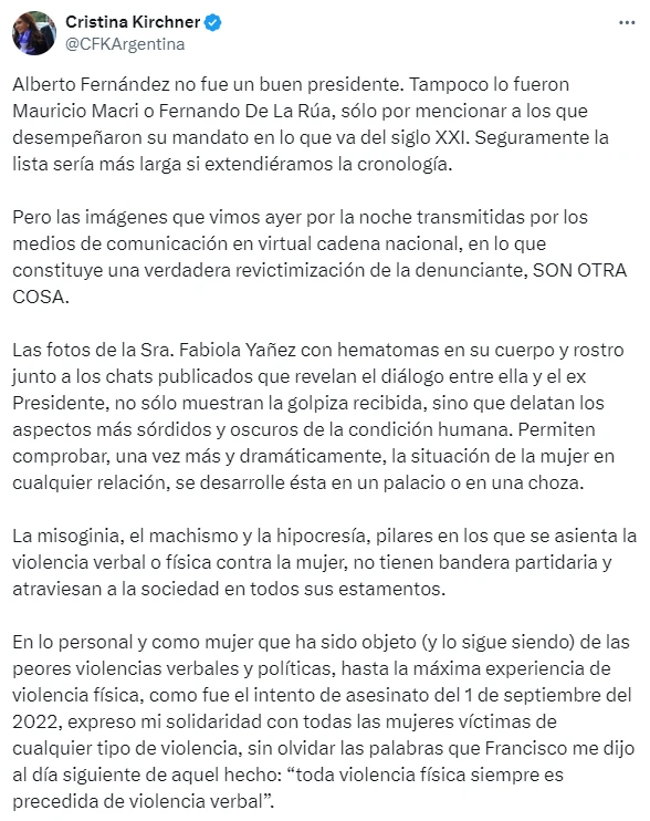 La exmandataria de los argentinos, quien también ocupó el cargo de vicepresidenta de la Nación en el mandato de Fernández, publicó este viernes en sus redes sociales un contundente descargo repudiando la violencia que se refleja en las imágenes de Yañez que se filtraron en las últimas horas.