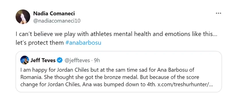 La famosísima deportista Nadia Comaneci retomó este polémico asunto desde un comentario en la red social X (ex Twitter) que decía que estaba contenta por Jordan Chiles, pero al mismo tiempo mal por Ana Barbosu.