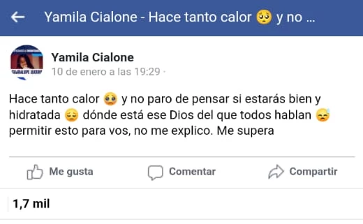 El próximo 14 de enero se cumpliran siete meses de la desaparición de la niña y no hay un día en que su madre no utilice las redes y todos los medios a su alcance para encontrarla. En esta semana de altas temperaturas desconsolada escribió, "Hace tanto calor y no paro de pensar si estarás bien y hidratada dónde está ese Dios del que todos hablan permitir esto para vos, no me explico. Me supera".