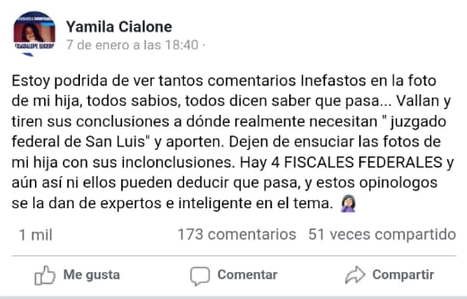 "Estoy podrida de ver tantos comentarios nefastos en la foto de mi hija, todos sabios, todos dicen saber que pasa... Vayan y tiren sus conclusiones donde realmente necesitan: Juzgado Federal de San Luis, y aporten", comenzó diciendo desde su Instagram personal Cialone.
