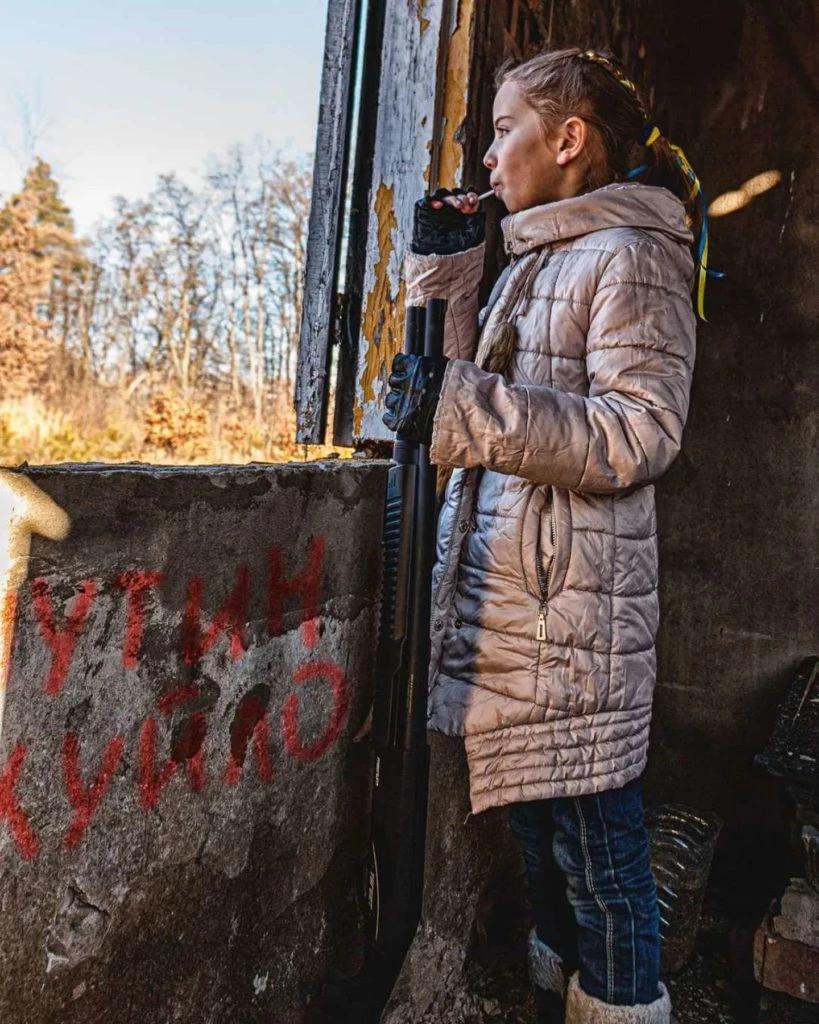 Esta vez, la foto que recorrió el mundo fue la de una nena ucraniana que está sentada en una ventana con un chupetín en la boca y con el detalle impactante que está portando un rifle en su mano, con total normalidad. En su pelo está colgando una cinta con los colores azul y amarillo, representando a su país. La imagen fue compartida incluso por el expresidente del Consejo Europeo, Donald Tusk.