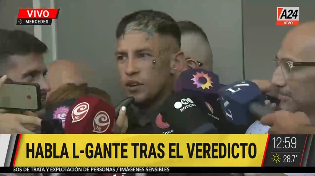 Tras varios días de juicio oral, este lunes la Justicia tomó una decisión y condenó al intérprete a tres años de prisión de ejecución condicional. Al salir del tribunal, L-Gante se encontró con diferentes medios, entre los que se encontraba A24, y expresó sin vueltas: "Buenas tardes para todos, espero que arranquen la semana de 10".