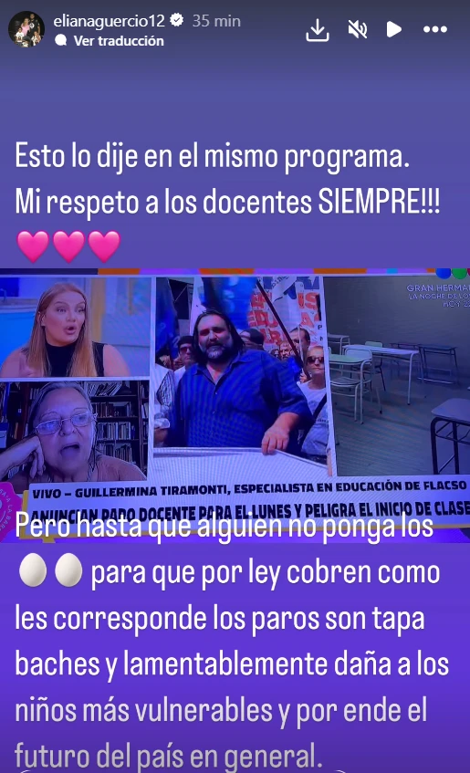 "Esto lo dije en el mismo programa. Mi respeto a los docentes, siempre. pero hasta que alguien no ponga los huevos para que por ley cobren como les corresponde los paro son los tapa baches y lamentablemente daña a los niños más vulnerables y por ende el futuro del país en general", escribió.