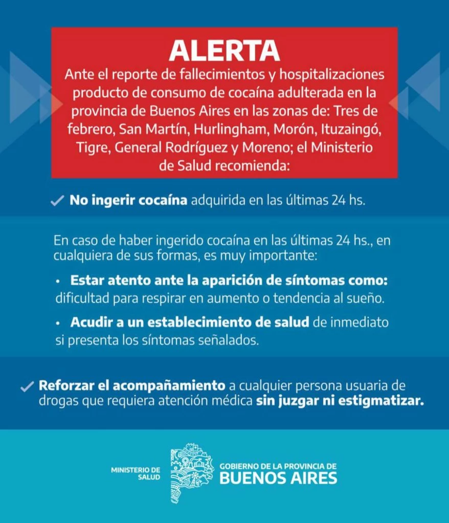 Asimismo, lo más preocupante de este caso es que la cifra de muertos puede ascender: “Se informa que hay fallecidos en la vía pública y en domicilios, por lo que aún no se pudo identificar la cantidad”. Ante esto, desde el ministerio de Salud bonaerense se emitió una alerta epidemiológica por “intoxicación por consumo de cocaína adulterada”.