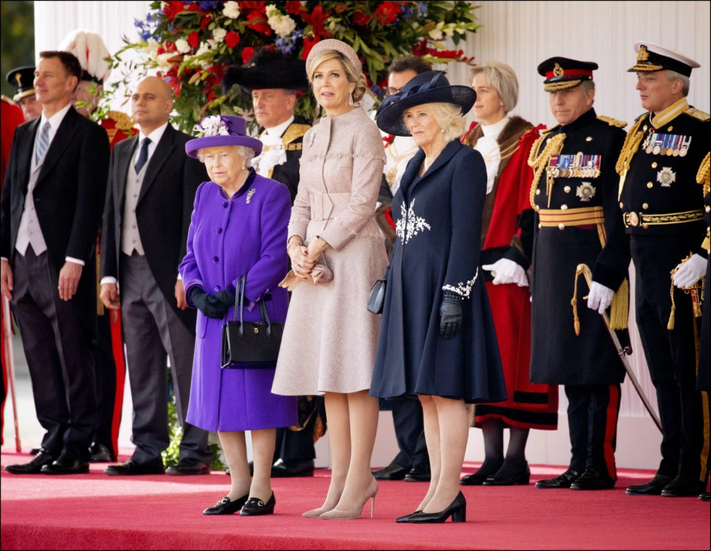 la reine Elisabeth II d'Angleterre, la reine Maxima des Pays-Bas, Camilla Parker Bowles, duchesse de Cornouailles lors de la cÈrÈmonie d'accueil pour la visite du roi Willem-Alexander des Pays-Bas et de la reine Maxima au Royaume Uni le 23 octobre 2018 ‡ Londres. London, 23-10-2018 State Visit of King Willem-Alexander and Queen Maxima to the United Kingdom. welcome ceremony at the Horse Guards Parade