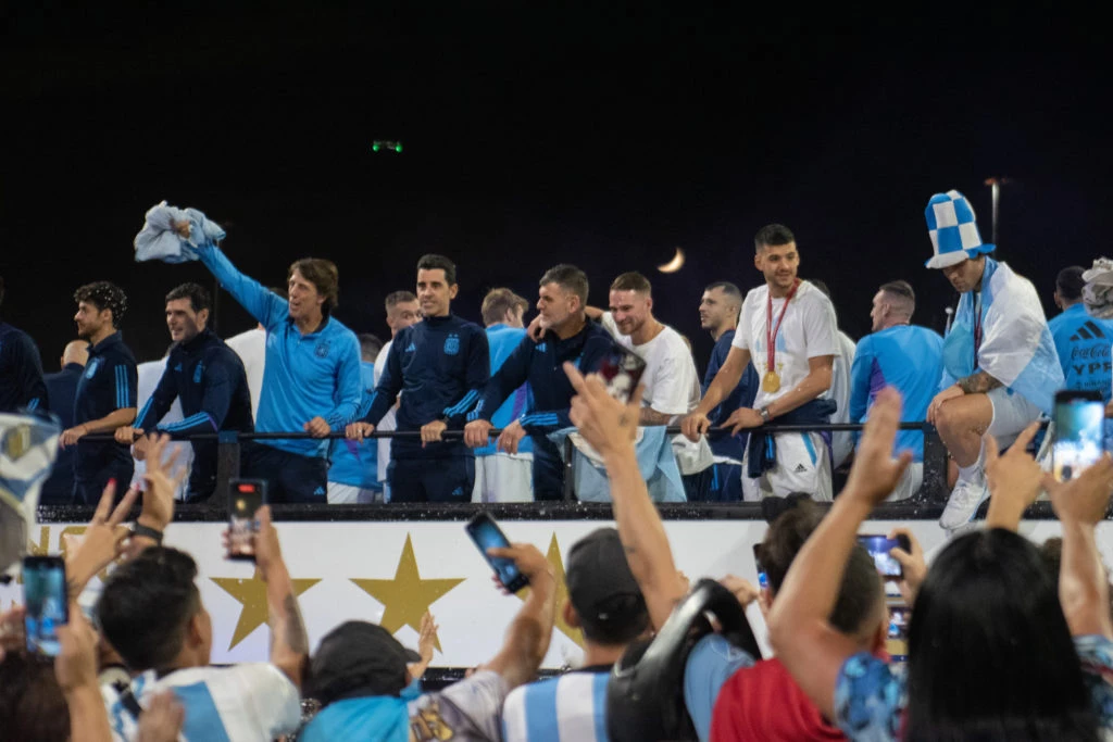 Caminaron por la alfombra roja rumbo al micro descapotable que los llevaría al predio de Ezeiza, mientras de fondo La Mosca tocaba el hit mundialista. Pero todavía no habían dimensionado lo que les esperaba afuera del aeropuerto.