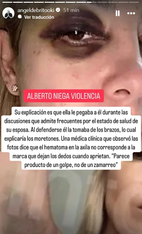 Luego, el conductor detalló: "Alberto niega violencia. Su explicación es que ella le pegaba a él durante las discusiones, que admite frecuentes, por el estado de salud de su esposa. Al defenderse, él la tomaba de los brazos, lo cual explicaría los moretones".