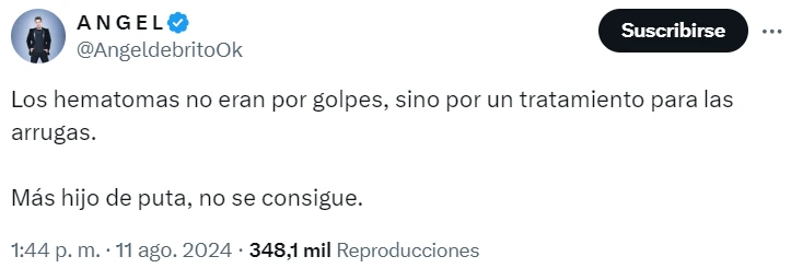 A su vez, en su cuenta de X, De Brito compartió un tajante mensaje sobre lo que dijo el expresidente. "'Los hematomas no eran por golpes, sino por un tratamiento para las arrugas'. Más hijo de p*, no se consigue", sentenció el periodista, apuntando sin filtro contra Fernández por sus dichos.