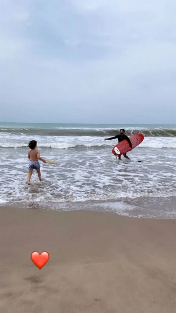 En esa jornada playera, Sabrina también filmó a Luciano, con la tabla de surf debajo del brazo, jugando en el mar con el pequeño.