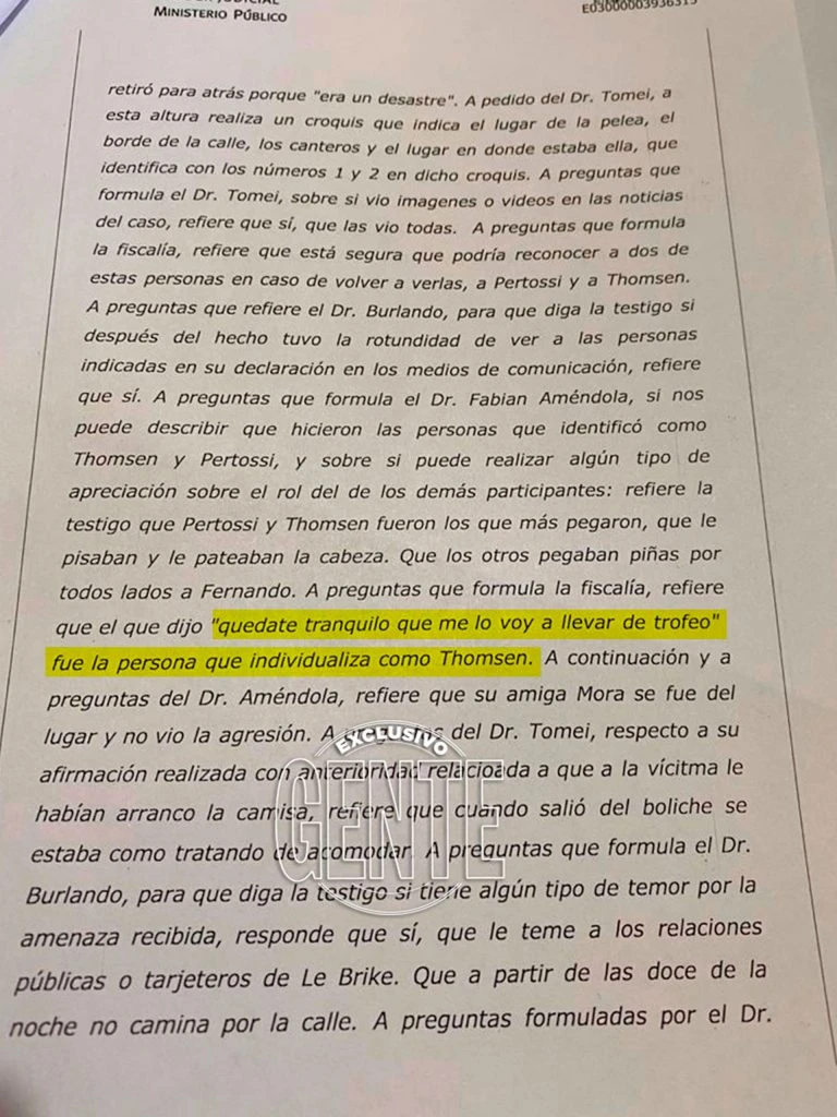 “Luego Máximo lo arrastró a Fernando hasta el cantero, lo apoyó de costado y le pegó una patada en la boca. Después de eso, no hubo más reacción. Fueron seis minutos en los que Thomsen y Ciro Pertossi (19) le dieron con todo y cuando lo dejaron, Fernando temblaba como una hoja. Una chica se le acercó a hacer RCP y estuvo como 15 minutos intentando reanimarlo pero no hubo caso, Fernando estaba muerto”.