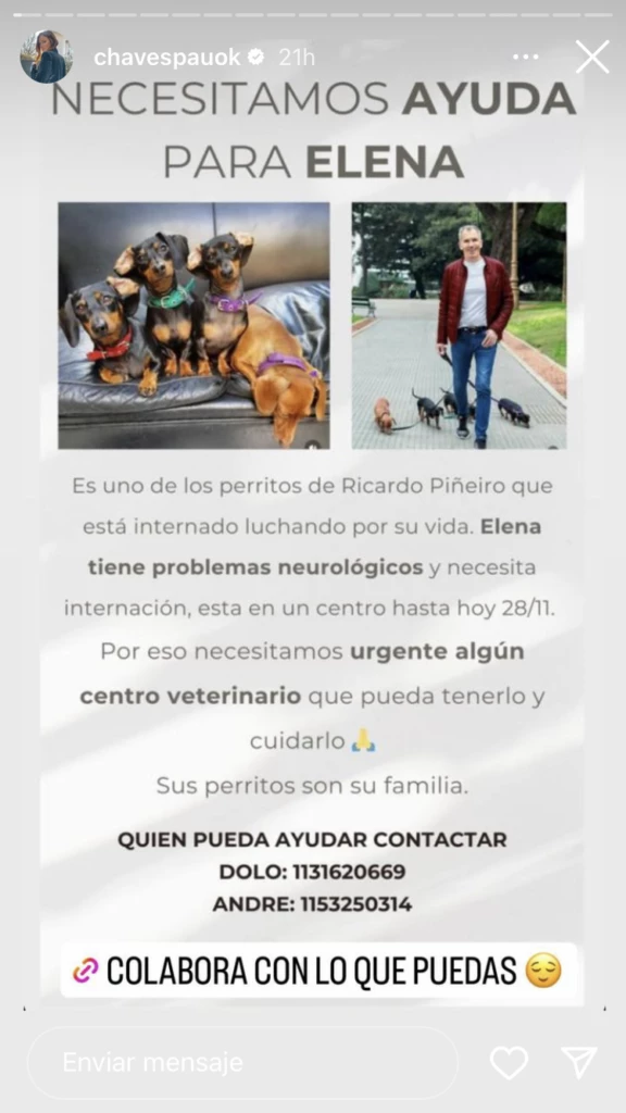 Por su parte, Paula Chaves, quien llegó al estrellato de la mano de "Richard" tras ganar el reality Super M, también compartió con sus 4,5 millones de seguidores en Instagram el pedido de ayuda para conseguir fondos para tratar la salud de Elena, la adorada can de su mentor.