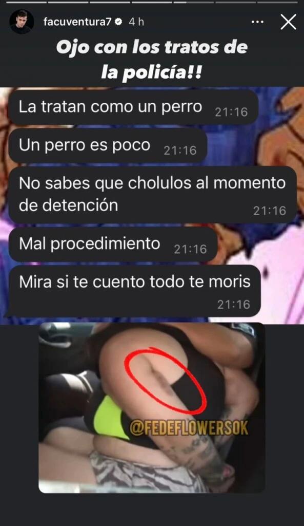 "Ojo con los tratos de la Policía", añadió Facundo Ventura en otro posteo que subió a sus redes con una segunda captura de chat con esa amiga de Morena.