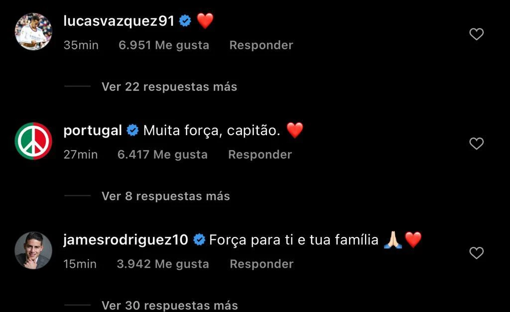 Álvaro Morata y Felipe Melo, compañeros del deportista en el equipo italiano Juventus, Alex Telles, su compañero actual del Manchester United junto a Diogo Dalot, fueron de las primeras personas en comentar la publicación del deportista portugues.