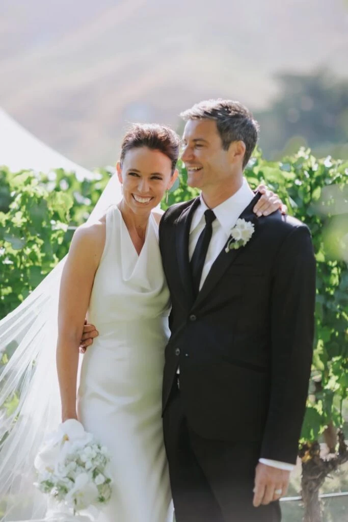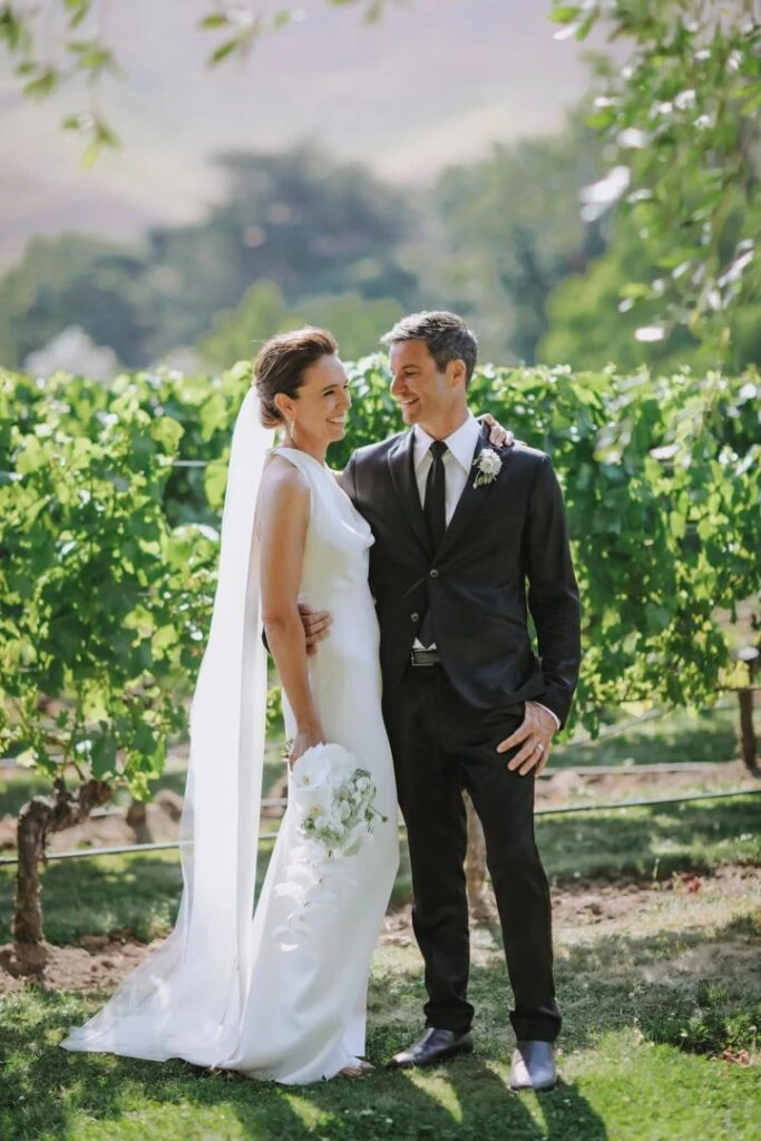 Tal y como se puede ver en las fotos de la boda, Ardern, de 43 años, apareció en la ceremonia con un vestido de novia largo y su marido, de 47 años, con un traje negro y una corbata del mismo color y ambos se pasearon entre los viñedos de la finca.