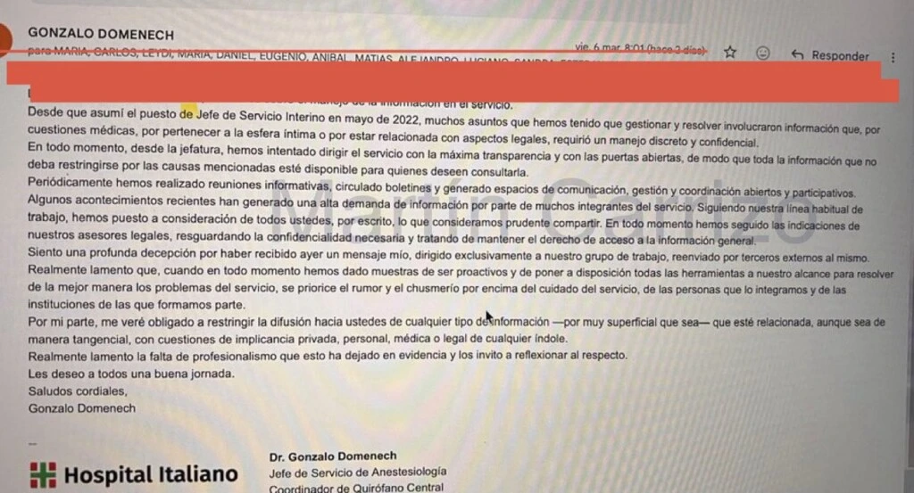 Por su parte, el jefe de Anestesiología del Hospital Italiano se dirigió al personal médico de la institución a partir de un mail en el que destaca una probable filtración interna a partir del manejo de información. "Lamento que se priorice el rumor y el chusmerío por encima del cuidado del servicio, de las personas que lo integramos y de las instituciones de las que formamos parte", escribió con determinación Gonzalo Domenech.