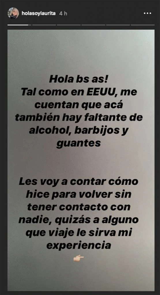 Laurita Fernández regresó a la Argentina luego de estar de vacaciones en los Estados Unidos y desde las redes mostró el operativo que montó junto a su familia para cumplir con el protocolo por el Covid-19 y evitar estar en contacto con otras personas.