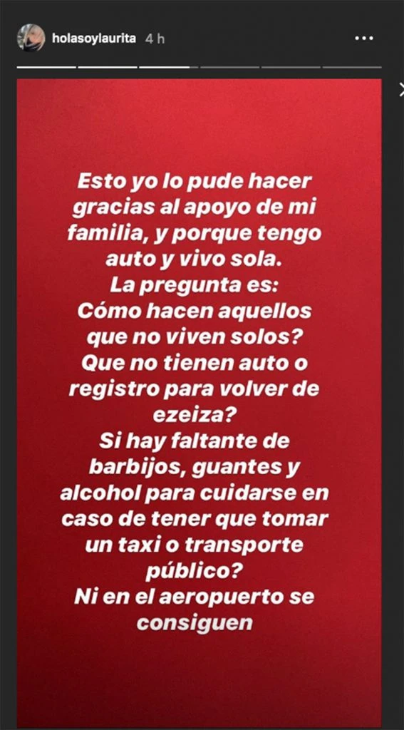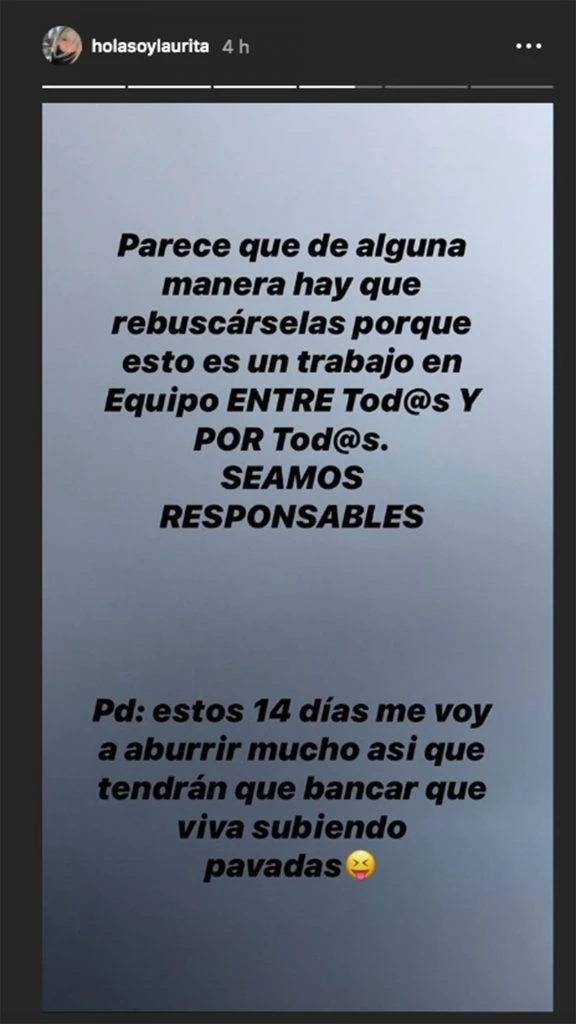 Laurita entiende que mucha gente no puede hacerlo porque no viven solos o no tienen autos pero recomendó que busquen la forma de tener la menor forma de contacto con otros.