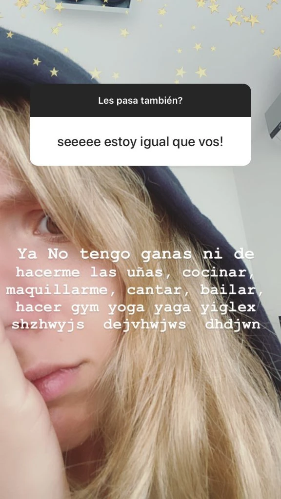 "¿No les pasa que hay días que la llevan bárbaro y otros que la pasan para el orrr...", preguntó la bailarina. "Ya no tengo ganas ni de hacerme las uñas, cocinar, maquillarme, cantar, bailar, hacer gym, yoga, yaga...", agregó.