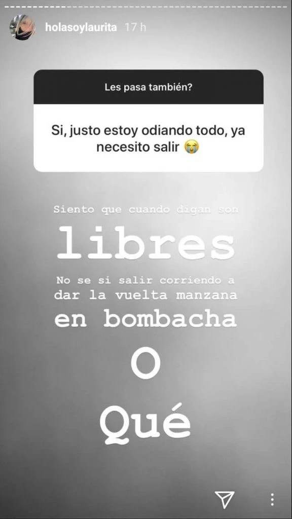 Pero a pesar de ya no estar en soledad, la artista está bajoneada. Laurita decidió abrir su Instagram para que sus seguidores le hagan preguntas y compartió sus sentimientos al alcanzar los 20 días de cuarentena.