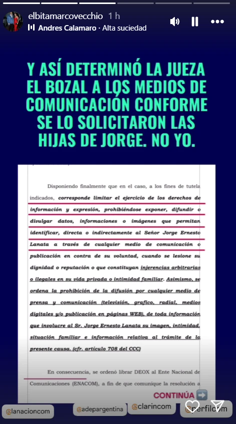En ese momento, compartió una imagen del pedido en la Justicia, que decía: "Solicito se ordene a la Sra. Marcovecchio y a sus letradas se abstenga de continuar difundiendo en cualquier medio de prensa o comunicación, información que involucre al Sr. Jorge Ernesto Lanata, su imagen, intimidad, situación familiar e información relativa al trámite de la presente causa".