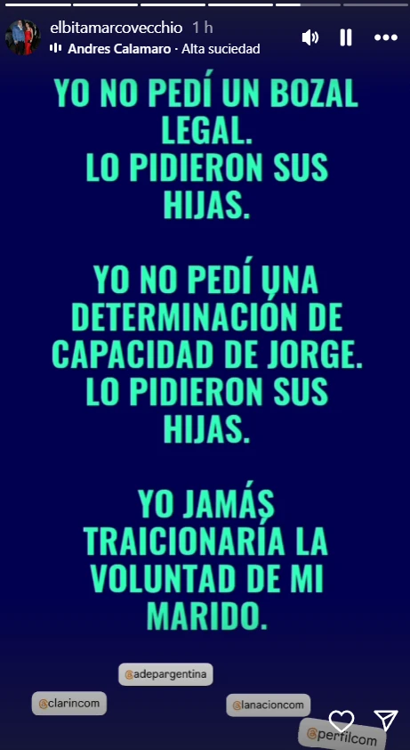 "Yo no pedí un bozal legal, lo pidieron sus hijas. Yo no pedí una determinación de capacidad de Jorge, lo pidieron sus hijas. Yo jamás traicionaría la voluntad de mi marido", sentenció Elba en su Instagram. Tanto en las historias anteriores como en esta, Marcovecchio eligió poner de fondo la canción 'Alta suciedad' de Andrés Calamaro.