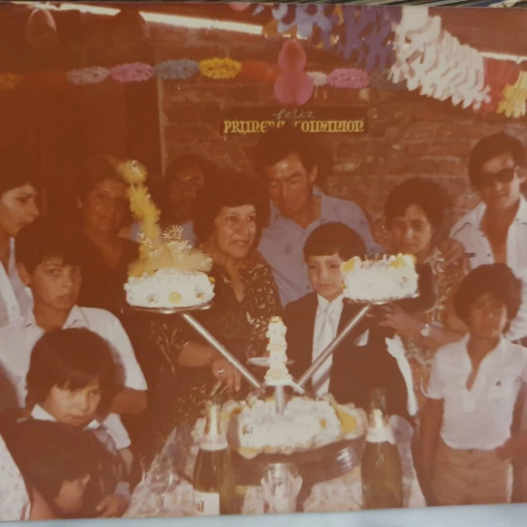 "En mi primera comunión con mis tíos y un papá de ese momento, que nunca les conté y han sido muy buenos conmigo... empezando por el de anteojos pacho, rito, beto, ruben (papa) y neni. Los agüero hermosa flia.", comenzó escribiendo.