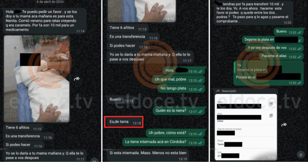 Las capturas mostraron mensajes en los que Tania le pedía dinero de manera reiterada. En uno de los intercambios más impactantes, ella le solicitó una transferencia de 10 mil pesos para comprar un medicamento, asegurando que una nena “había comido veneno para ratas creyendo que era caramelo”. En otro mensaje, incluso, le envió una foto de la menor internada y le explicó que tenía “6 añitos”, reforzando el pedido con detalles médicos.