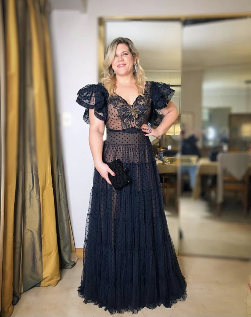 En tanto, Dominique Metzger se robó las miradas de todos los presentes con su vestido escote en V en tul color azul marino y motas en terciopelo negro de la firma de Javier Saiach. La pieza contaba con unos importantes volados y una pechera bordada en hilos de seda y flores en nude, negro y vainilla. Asimismo, fiel al estilo de Saiach, la falda tenía bastante movimiento y varias capas de tul.