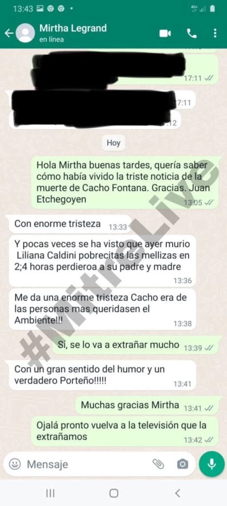 Mirtha Legrand también habló sobre la muerte de una de las personas más importantes en la radiofonía argentina, en comunicación con el periodista Juan Etchegoyen, "Me da una enorme tristeza, de las personas más queridas del ambiente”.