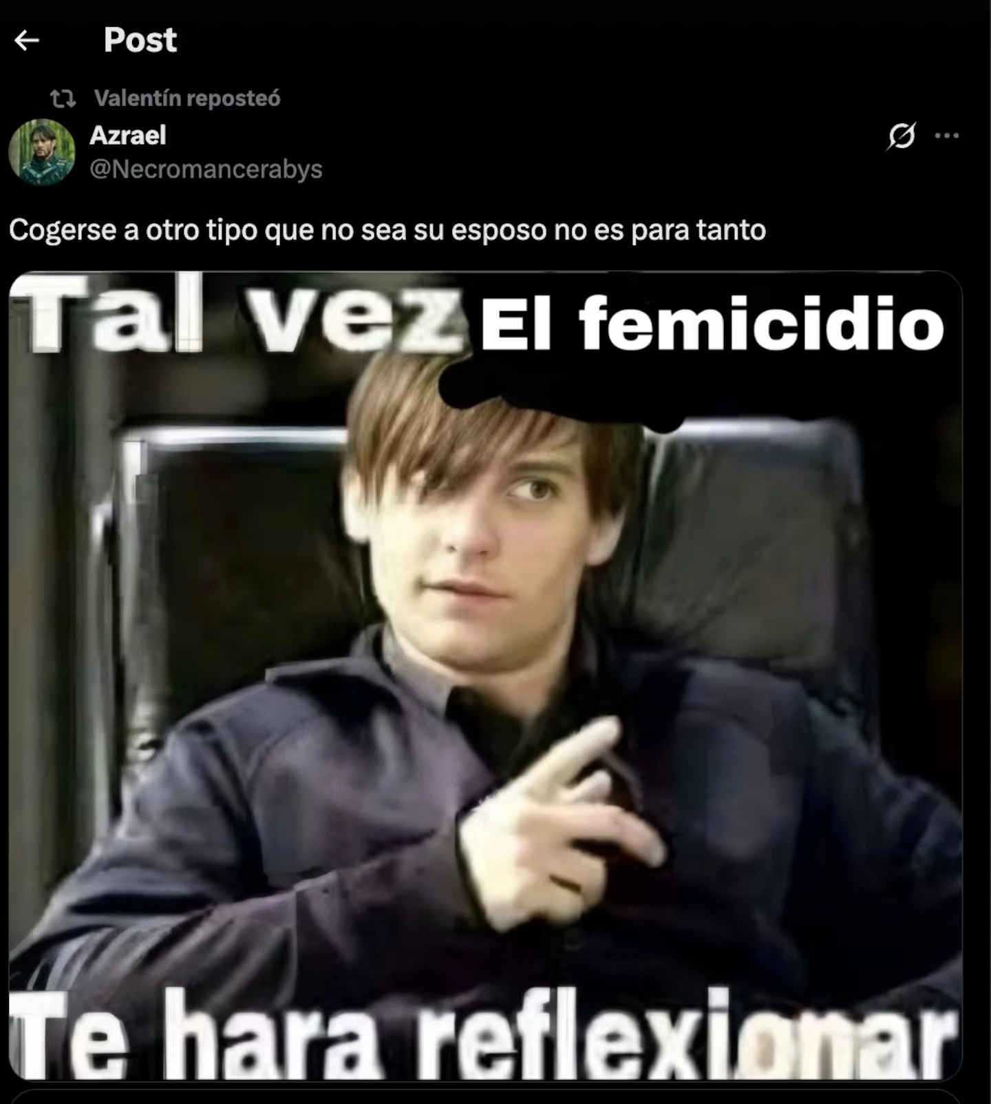 El punto más llamativo —y el que conecta de lleno con la idea de “relativizar” la violencia de género— es la circulación de memes que banalizaban el femicidio. En particular, se difundió la captura de una republicación atribuida a Alcida con una frase que, por su crudeza simbólica, generó un repudio inmediato: “Tal vez el femicidio te hará reflexionar”.