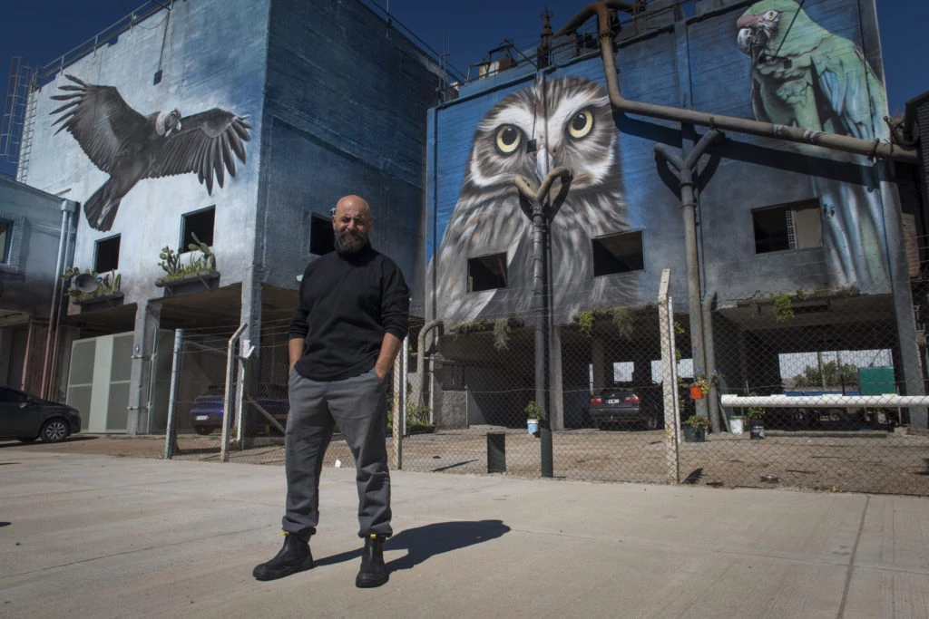 Sagatori es el presidente Fundación Cultural Andén 2222 y hace algunos años empezó a darle vida a los silos y areneros de la Dársena F del Puerto de Buenos Aires a través de murales figurativos de animales. El vivaz proyecto que incluye un puma, un búho, un guacamayo verde, un colibrí, tres llamas, un águila mora, un cóndor andino y un yaguareté ñato, requirió “mucho esfuerzo físico y mental”. También más de 500 litros de pintura y abundante imaginación. A la hora de explicar cómo es su procedimiento de trabajo, él detalló: “Yo siempre me inspiro en las paredes. Voy a un espacio, lo miró y ya vislumbro los colores, los animales y demás”.
