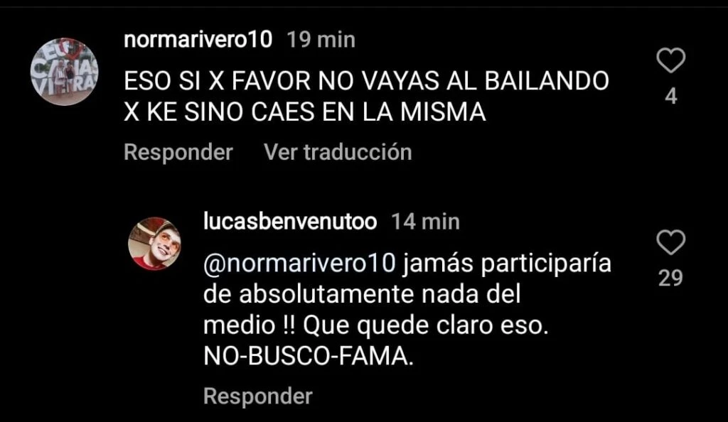 Es por eso que Lucas Benvenuto decidió negar rotundamente esta cuestión a través de sus redes sociales. En su Instagram personal, en una publicación reciente que realizó una seguidora le escribió: “ESO SÍ POR FAVOR NO VAYAS ALA BAILANDO PORQUE SINO CAES EN LA MISMA”. A lo que sorprendido por este comentario el patinador sobre hielo le respondió: “Jamás participaría de absolutamente nada del medio !! Que quede claro eso. NO - BUSCO - FAMA”.