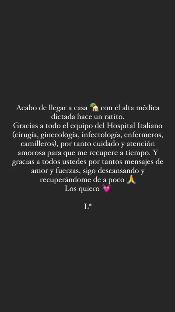 Este martes a la tarde celebró haber recibido el alta y agradeció al personal de salud del Hospital Italiano donde, asegura, recibió una atención de excelencia. "Gracias por tanto cuidado y atención amorosa para que me recupere a tiempo", escribió la periodista y agregó: "Sigo descansando y recuperándome de a poco".
